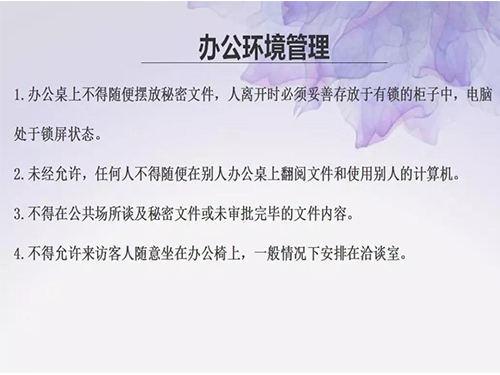 培訓(xùn)現(xiàn)場,結(jié)合現(xiàn)實(shí)工作情況,向大家明確了保密工作的必要性,加深了大家對于商業(yè)秘密保密工作的重視,并對辦公環(huán)境保密工作的安全防范措施也加以指導(dǎo)。