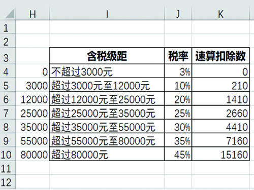 將臨界值手工寫出來(lái),在K4輸入0,K5輸入公式,下拉公式計(jì)算速算扣除數(shù)。